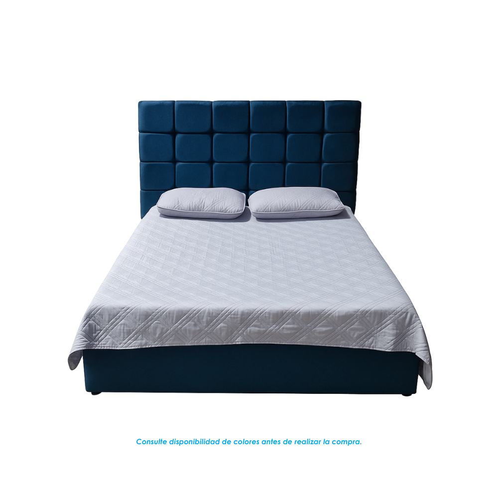 La cama tiene un diseño moderno y elegante. El respaldo es alto, acolchonado y tapizado en tela con costuras que le da una apariencia a capitoné formando un patrón de cuadros, lo que le da un estilo clásico y sofisticado. Peso soportado 200Kg