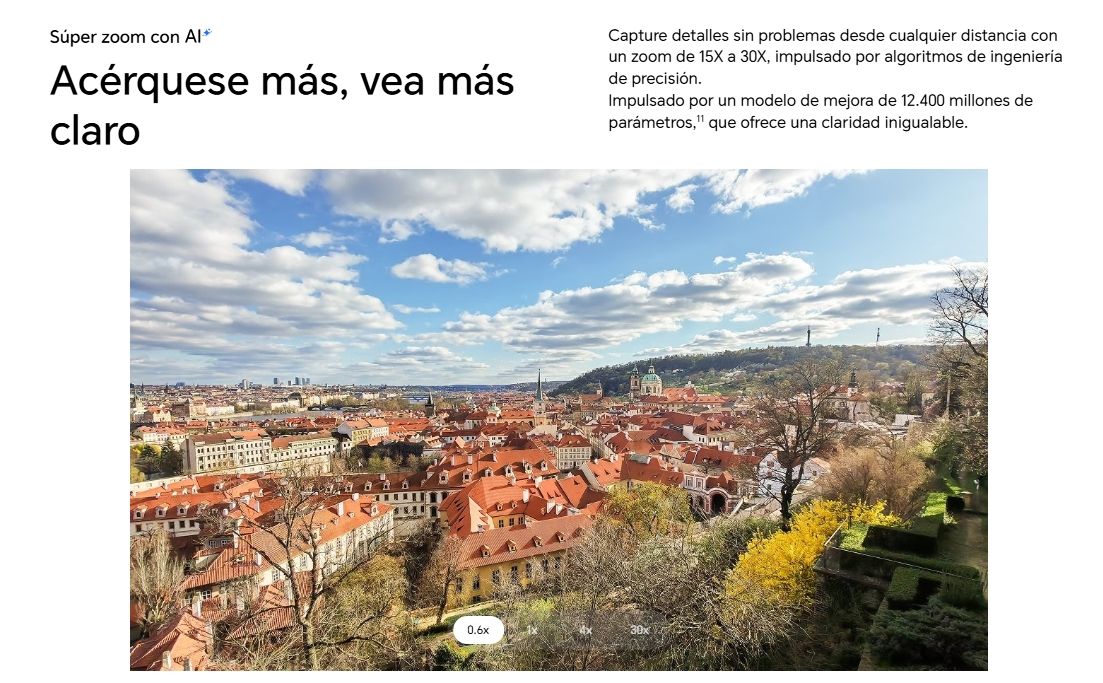 Modos de CapturaFoto en movimiento, Retrato, Filtro, Capturar sonrisas, Reflejo del espejo, Temporizador, Control de gestos, Noche, Marca de agua, ALTA RES, Multi-Video, etc.//Zoom Digital 30x