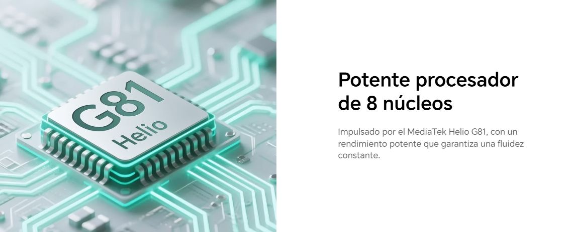 ProcesadorMediaTek Helio G81, arquitectura Octa-Core (2×A75 @2.0GHz + 6×A55 @1.7GHz)