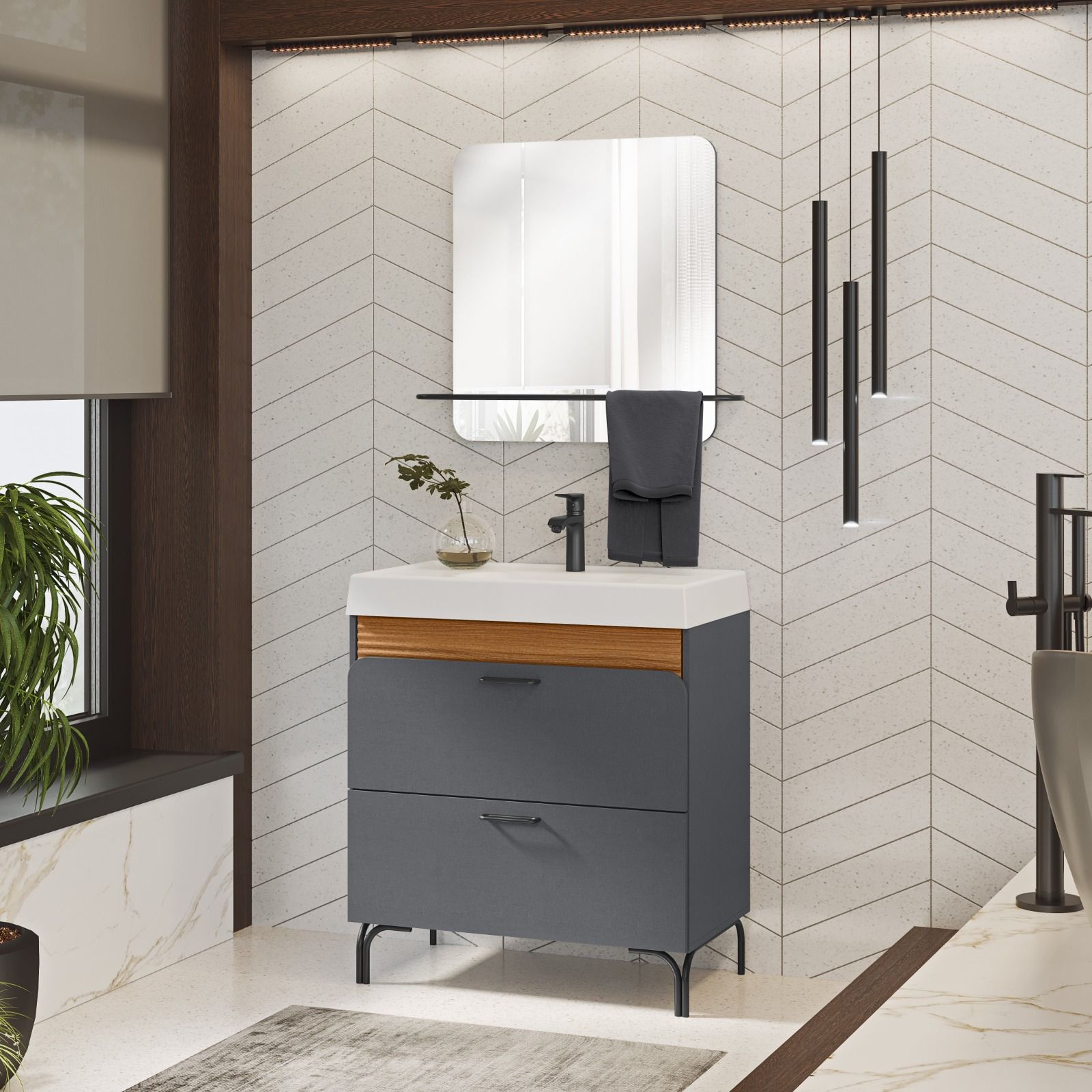 Este es el caso del mueble de baño CHARM, diseñado para embellecer y optimizar el espacio de su baño o tocador. Cuenta con dos cajones y una puerta abatible para guardar productos de higiene y belleza. Está fabricado en MDF/MDP recubierto de melamina, lo que garantiza un excelente acabado y durabilidad.