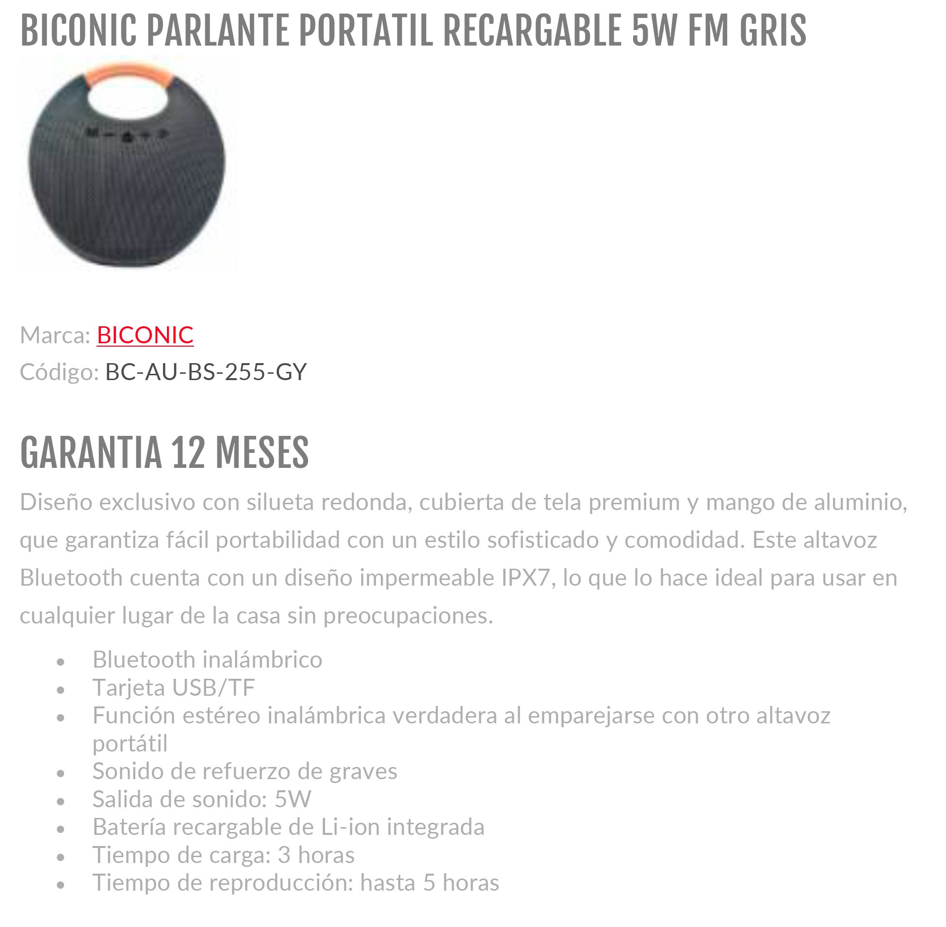 Parlante BICONIC BC-AU-BS-255-GY Negro