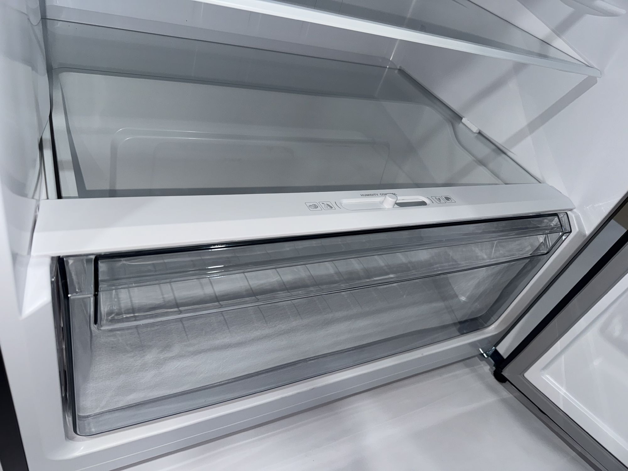 En su interior, ofrece una distribución amplia y bien organizada, con repisas de vidrio templado, compartimentos en puerta para botellas y envases de distintos tamaños, y un cajón transparente para frutas y verduras, diseñado para mantenerlos frescos por más tiempo. El congelador superior amplio con panel de control que se ilumina y muestra la temperatura actual.