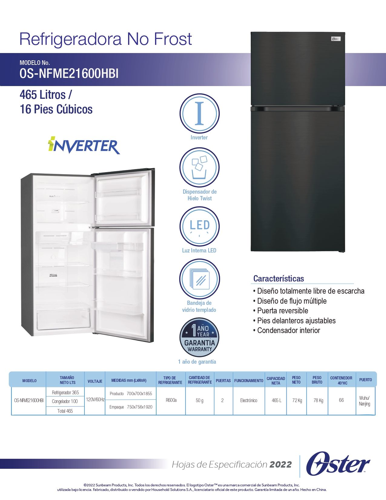 Refrigeradora OSTER OS-NFME21600HBI 16 Pies