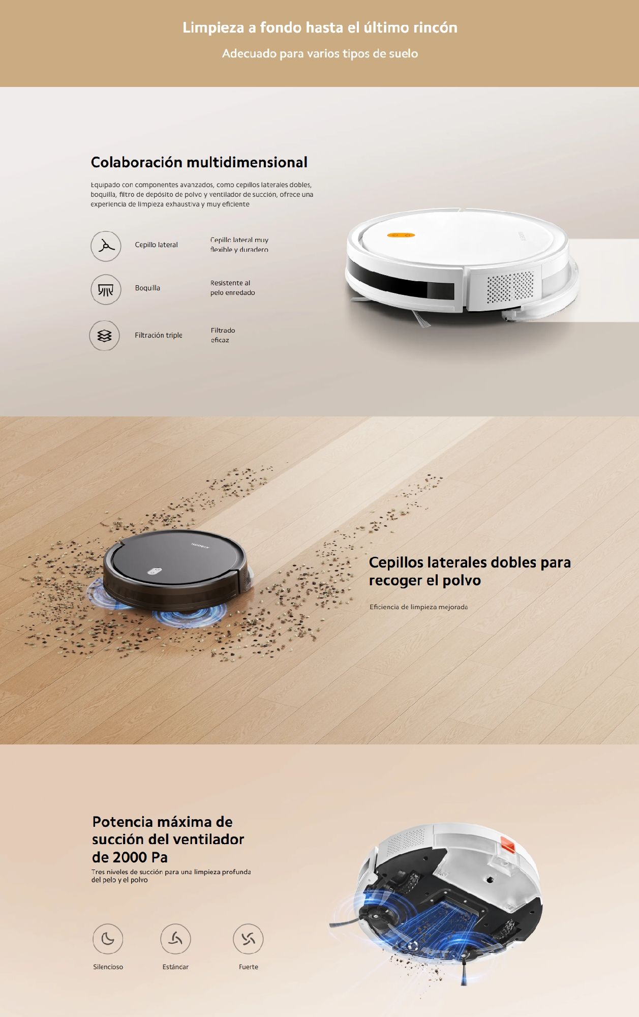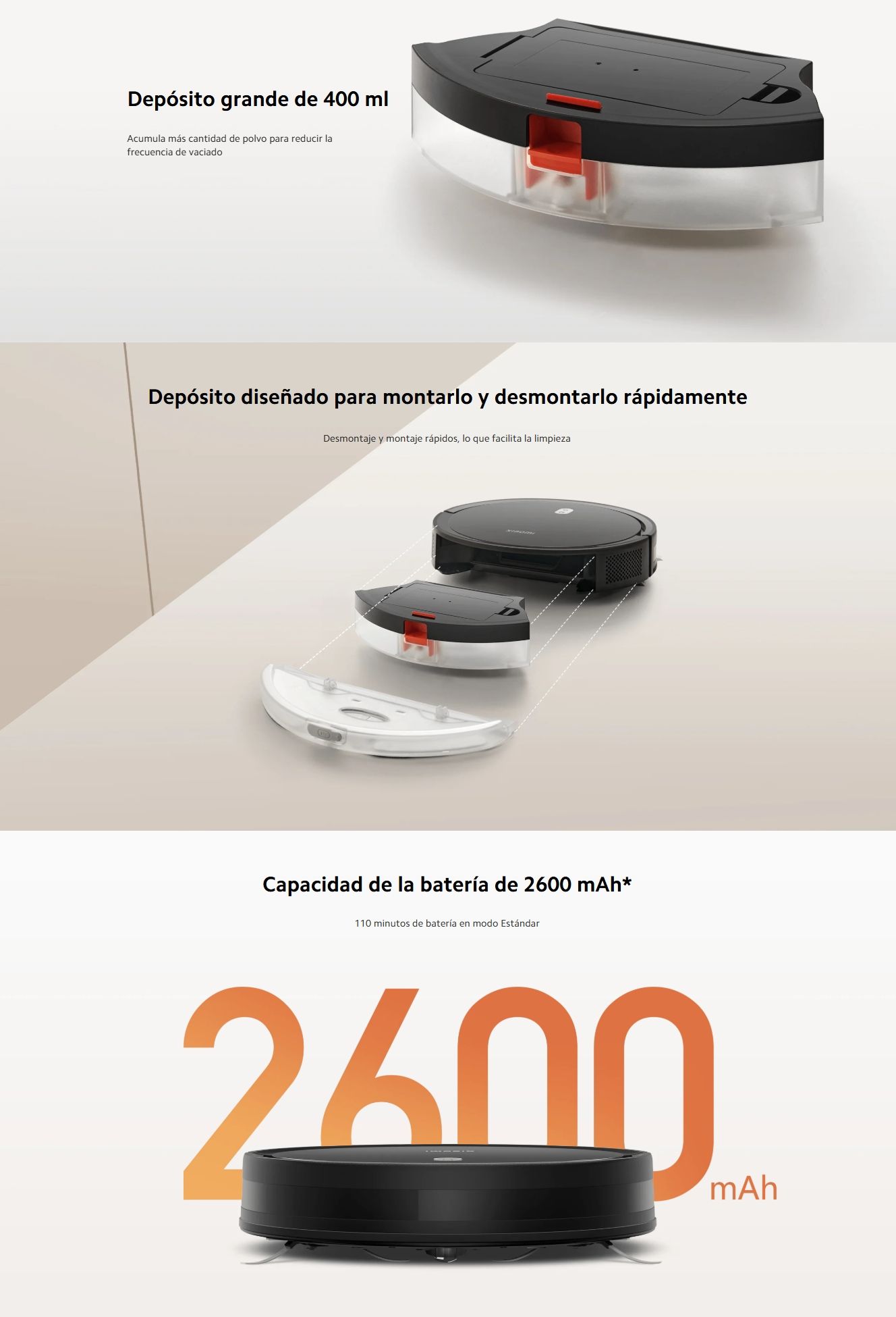 Incluye: El robot, base de carga, adaptador, cepillo principal, cepillo lateral, depósito de polvo, soporte con mopa para fregar, cepillo de limpieza y manual de usuario.