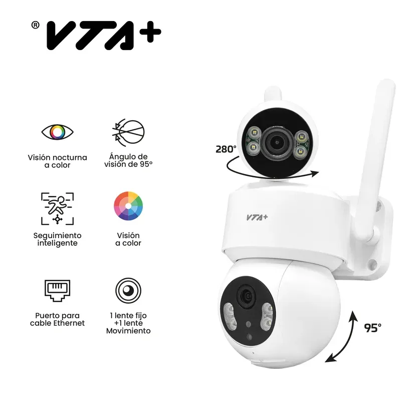 Cámara 2K 4MP con doble lente: uno fijo de 2 MP y otro móvil de 2 MP. Rotación horizontal de 280° y vertical de 95°. Ángulo de visión de 100°. 8 LEDs blancos para mejor visión nocturna. Protección IP65. Modo privacidad. Detección de sonido y movimiento con alertas en la app. Compatible con protocolo ONVIF para conectar con NVR. Visión nocturna automática con LEDs IR. Grabación en Micro SD hasta 128GB (no incluida) o en la nube. Micrófono y altavoz incorporados para audio bidireccional.