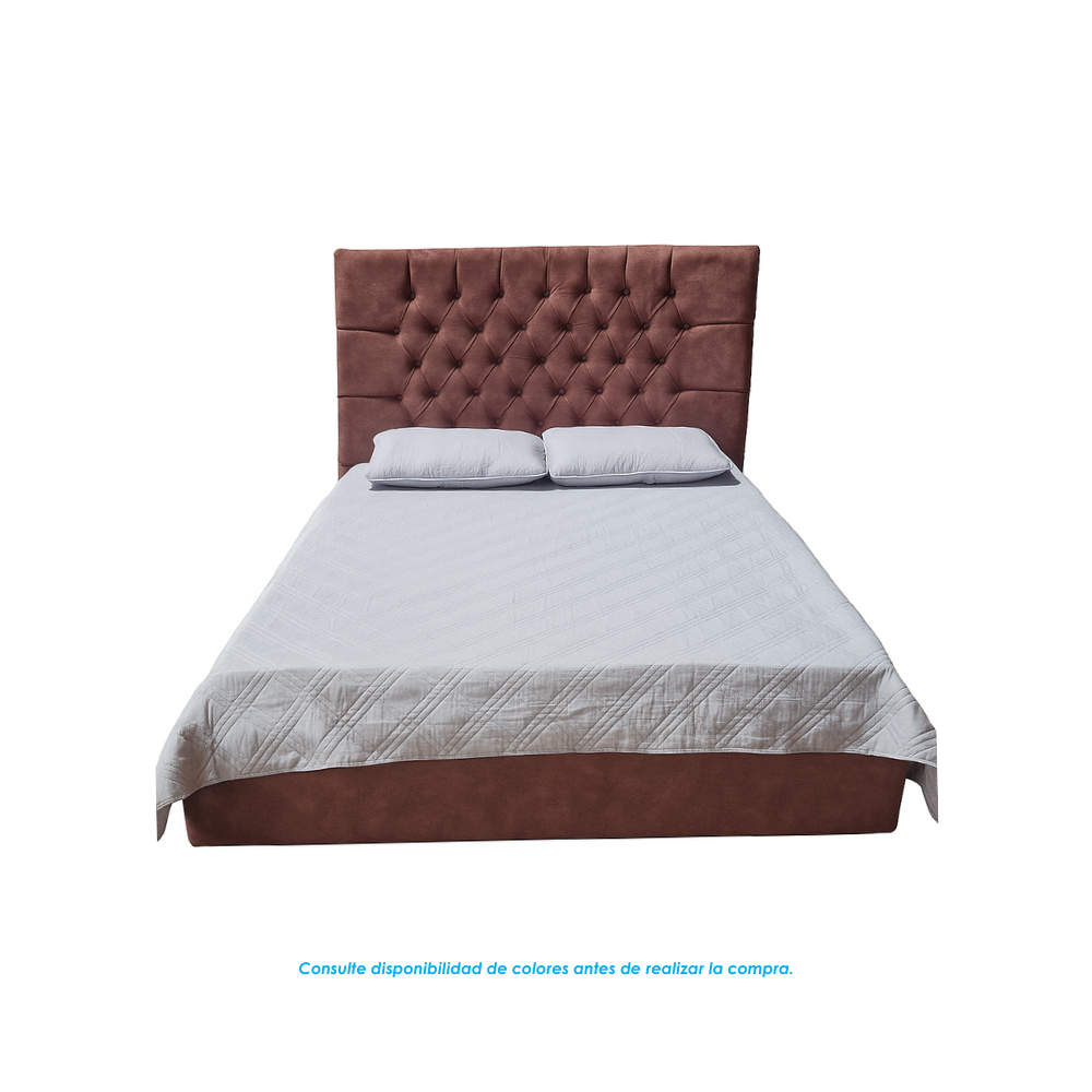 La cama tiene un diseño moderno y elegante. El respaldo es alto, acolchonado y tapizado en tela con capitoné formando un patrón de rombos, lo que le da un estilo clásico y sofisticado. Peso soportado 200Kg