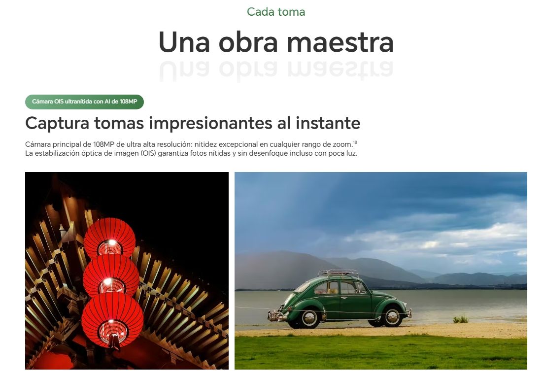 Modos de CapturaCaptura de momentos destacados, Foto en Movimiento, Fotografía con IA, Apertura, Noche, Retrato (incluye modo belleza), Pro, Panorámica, Filtro, Fotografía a intervalos, Alta resolución, Captura de sonrisas, Cámara lenta, Gran angular, Multi-video, Marca de agua, Escanear documento, Temporizador
