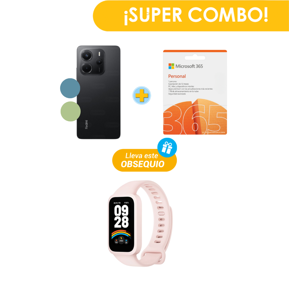 Combo Escolar Celular XIAOMI Redmi Note 14 256GB + Licencia MICROSOFT Office 365 1 Año + Reloj XIAOMI Smart Band 9 Active