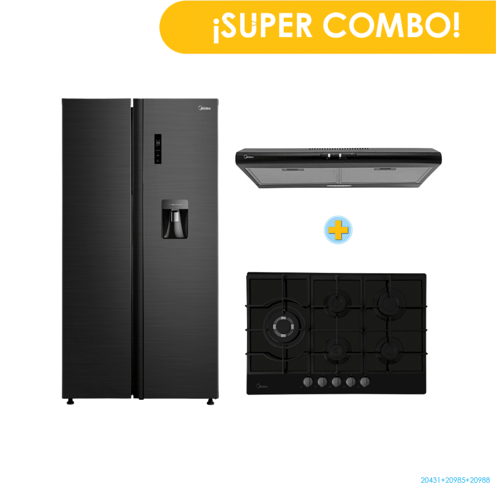 Combo Refrigeradora MIDEA MDRS710FGM28W + Plantilla para Empotrar MIDEA MTGB30TL3402GG + Extractor Grasa MIDEA MJUD30S3GB