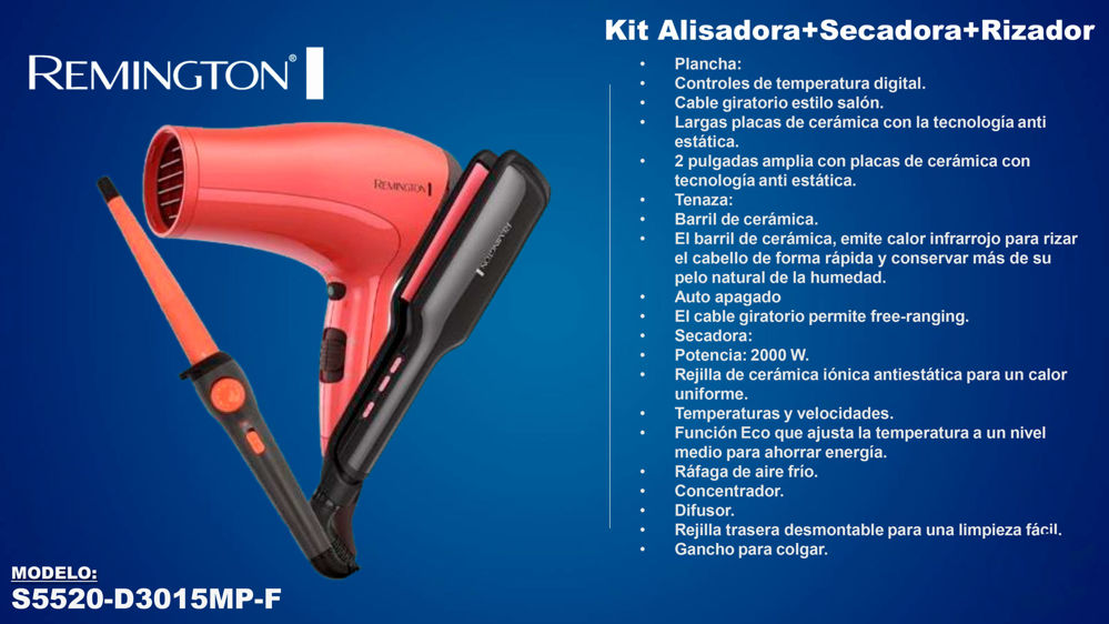 Combo REMINGTON Plancha + Rizador + Secadora S5520-D3015MP-F
