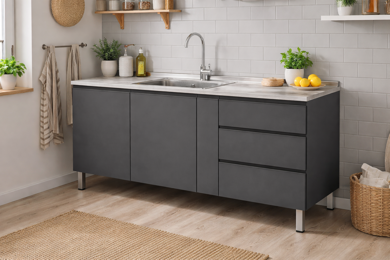 La línea Gaia de gabinetes de cocina de Acero es sofisticada, cuenta con puertas de diseño moderno con bordes rectos, sin agarraderas, bisagras de cierre suave patas de aluminio, tiradores de perfil de aluminio, fabricados en acero electrogalvanizado y protegidos con pintura en polvo electrostática.
