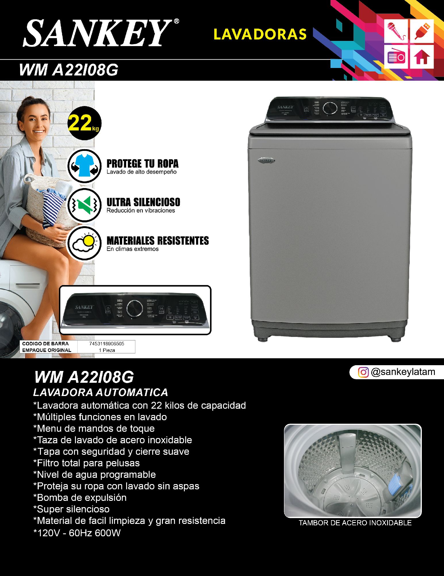 Lavadora Automática SANKEY WM-A22I08G 22Kg