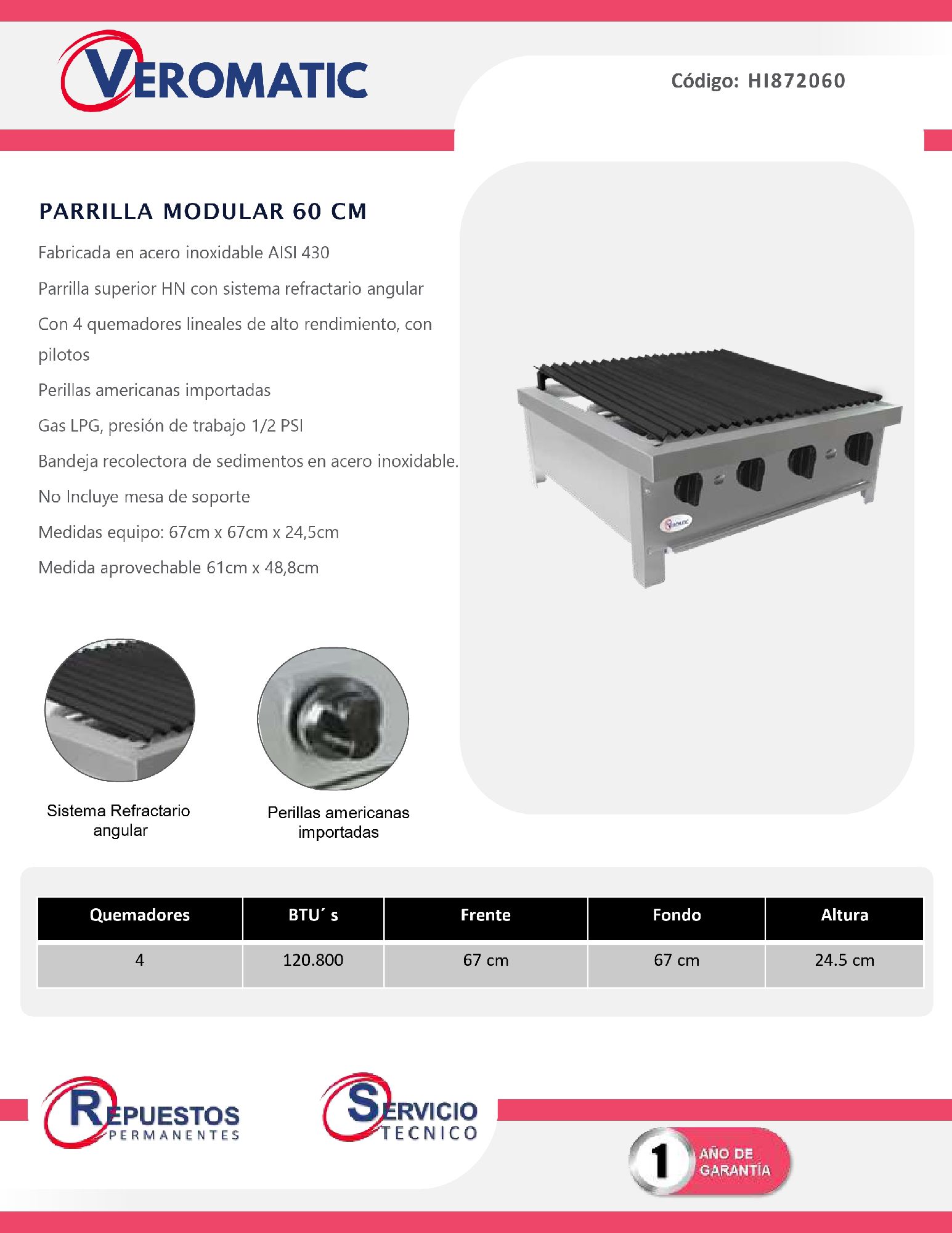 ¡Prepara tus comidas con la mejor calidad y eficiencia con la Parrilla Modular de 60Cm de VEROMATIC! Fabricada en acero inoxidable AISI 430, esta parrilla cuenta con una parrilla superior con sistema refractario angular para cocinar de forma profesional. Sus 4 quemadores de alto rendimiento y componentes americanos aseguran una cocción rápida y eficiente. Además, viene con bandeja recolectora de sedimentos para una fácil limpieza. ¡No pierdas más tiempo y adquiere esta parrilla de alta calidad para tu cocina hoy mismo!