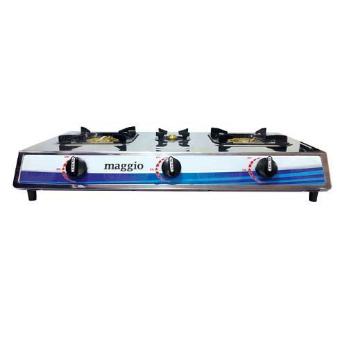 Plantilla a gas, con 3 quemadores de encendido por chispa y cuerpo de acero inoxidable.