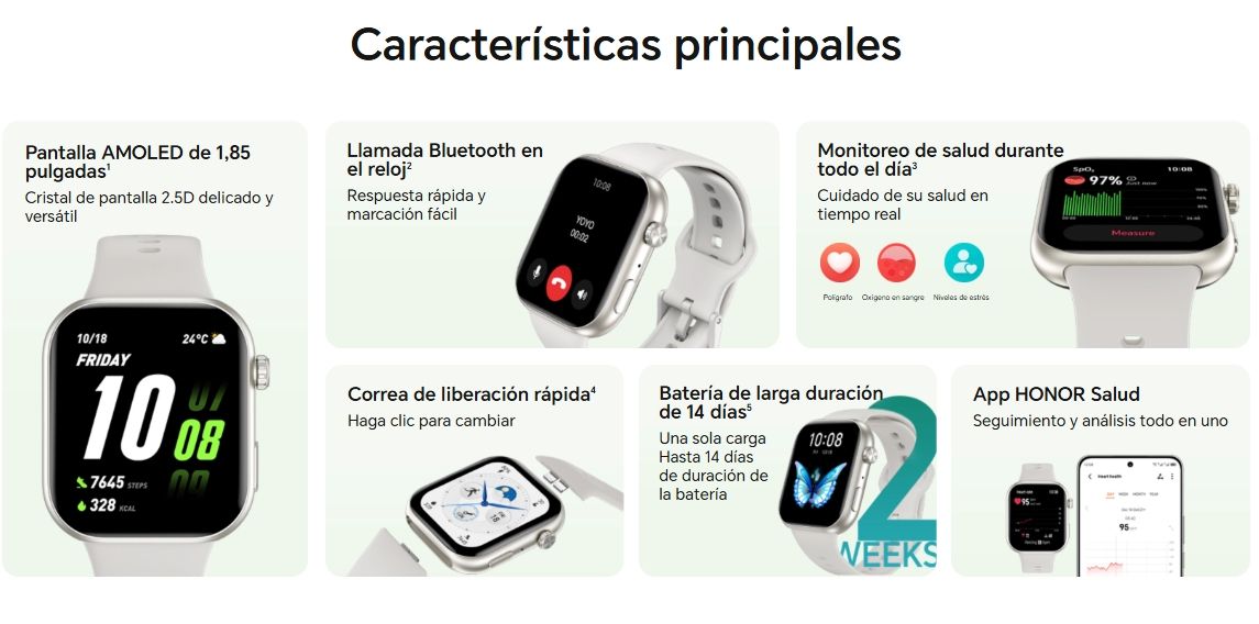 El Honor Choice InfoWear Watch 2i blanco es un smartwatch con pantalla AMOLED de 1,85" que destaca por sus llamadas Bluetooth, monitorización de salud completa (SpO₂, ritmo cardíaco) y una batería que dura hasta 14 días con uso típico. Pesa 26 g y tiene resistencia IP68/1 ATM.