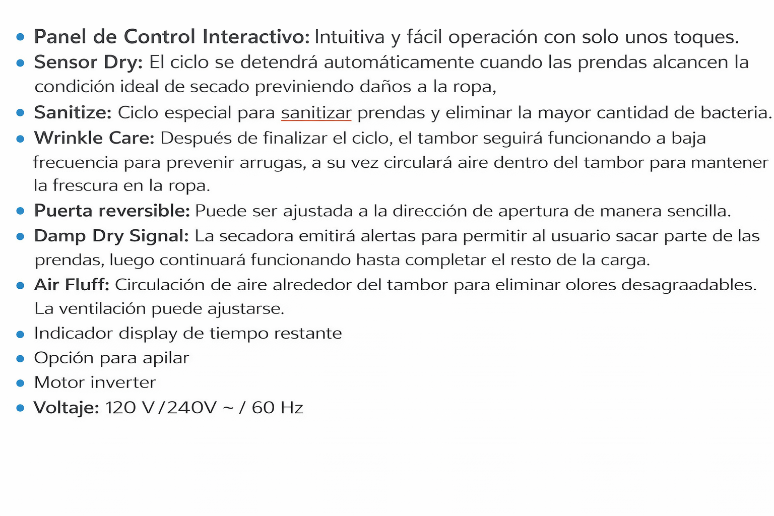 Ciclos SecadoNormal, Voluminoso, Toallas, Pesados, Sanitizar, Delicados, Air Fluff, Tiempo Secado, Secado Rápido, Calentador de Toallas., 10