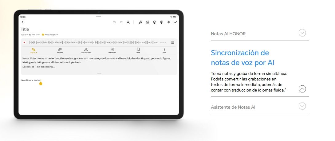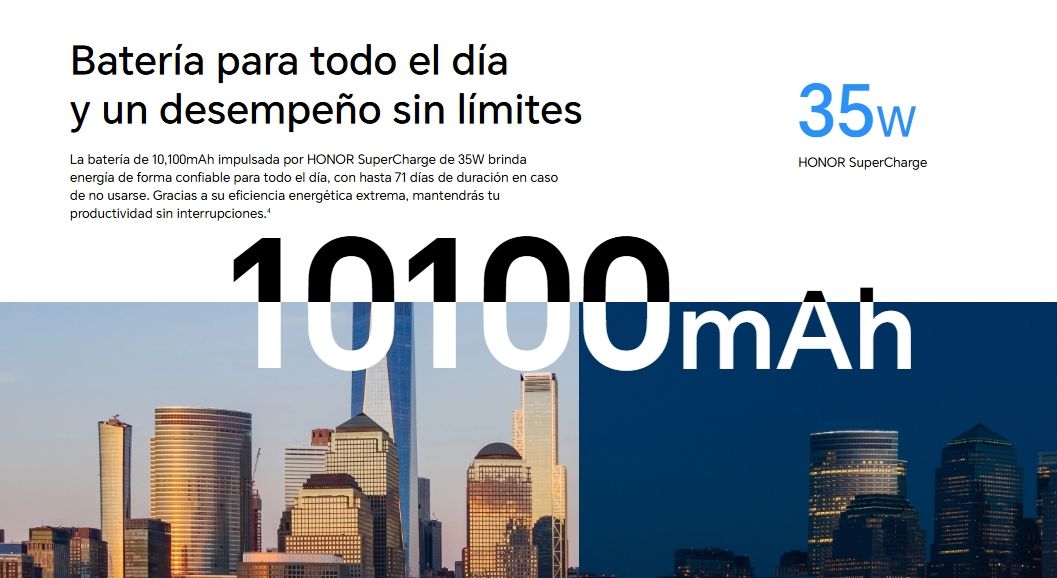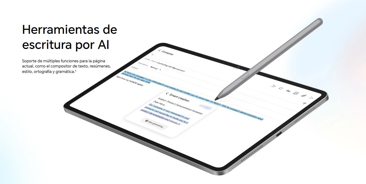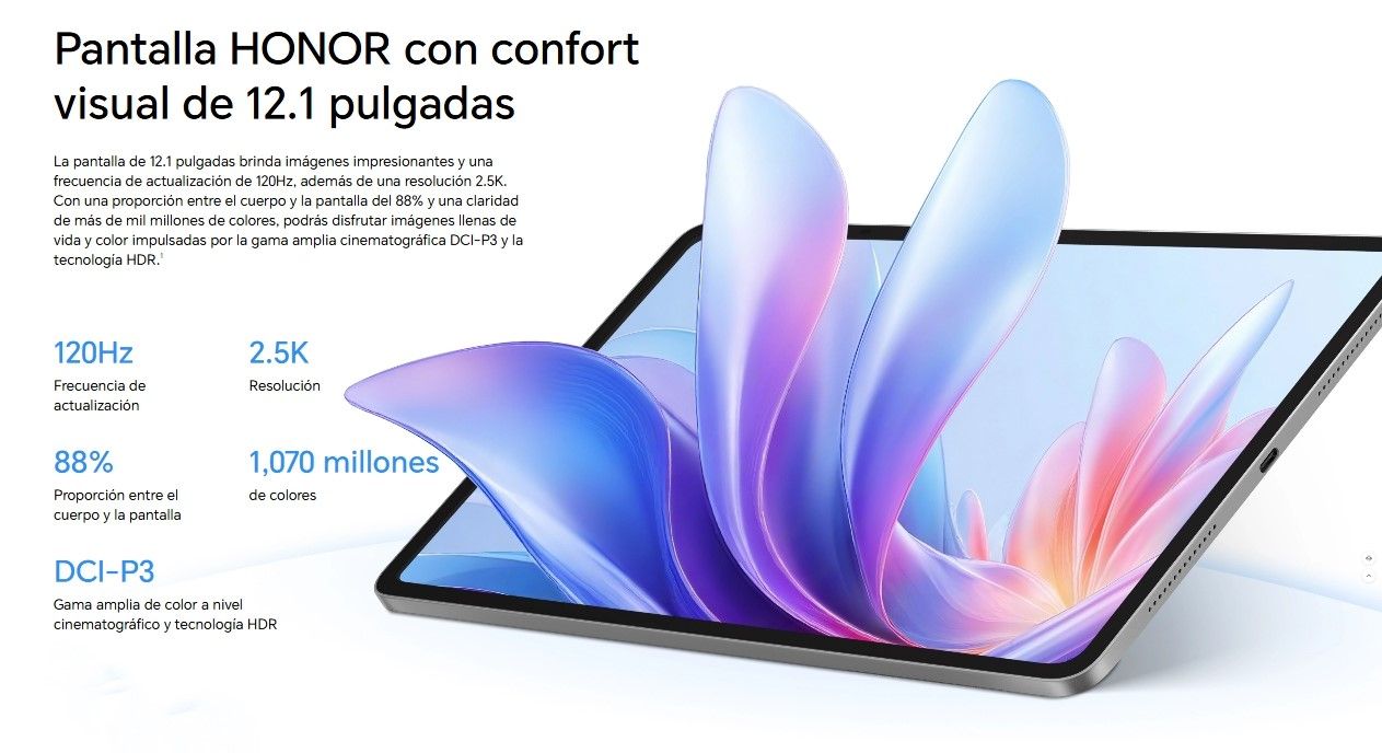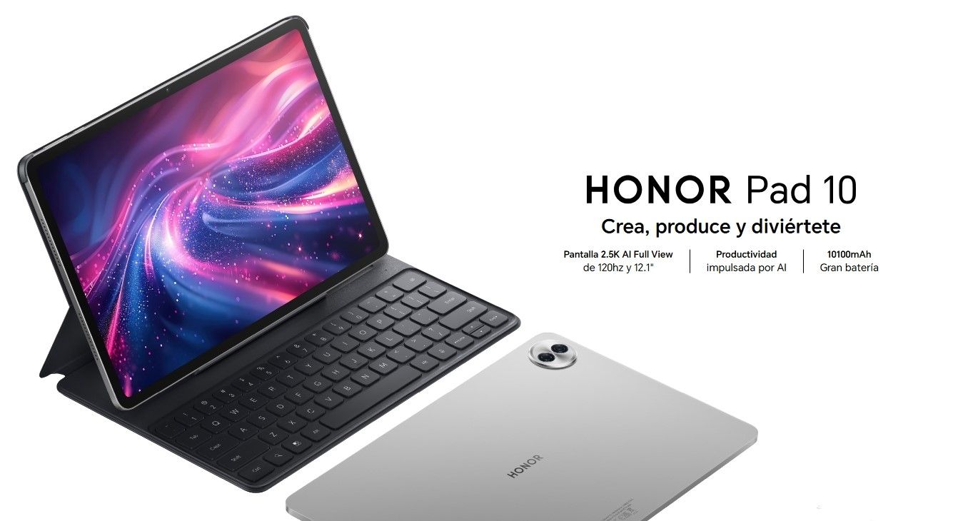 La HONOR Pad 10 es una tablet de alto rendimiento con pantalla de 12.1 pulgadas (2.5K a 120 Hz), procesador Snapdragon 7 Gen 3, 8 GB de RAM, 256 GB de almacenamiento y una batería de 10,100 mAh. Ofrece un sistema operativo Android 15 (con MagicOS 9), conectividad Wi-Fi 6 y funciones de IA para productividad, como subtítulos automáticos y herramientas de notas. Su sonido está potenciado por seis altavoces con HONOR Spatial Audio.